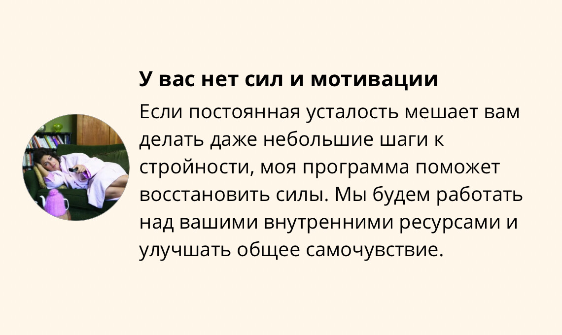 ✅ Проработаете негативные убеждения, мешающие худеть, и научитесь справляться с желанием бросить план питания